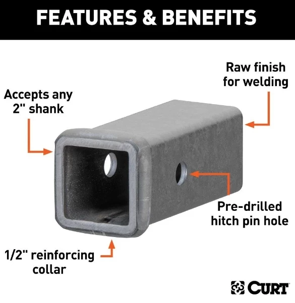 CURT fabrication steel receiver tubing can be used to extend the reach of your receiver or to create a piece of custom towing equipment. Each unit is equipped with a 1/2″ reinforcing collar for extra strength and has a raw finish to be ready for welding. This receiver tube has a 2″ x 2″ opening and measures 6″ in length.