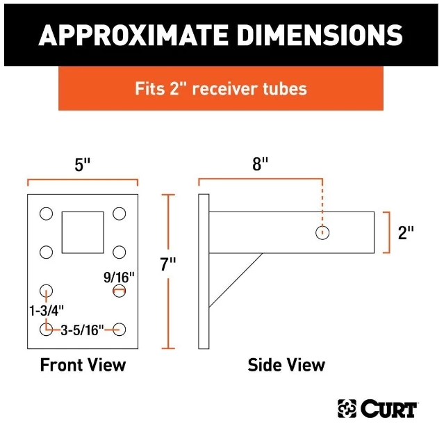 This adjustable pintle mount is designed to accept a bolt-on pintle hook or combination ball and pintle. It features a series of mounting holes to provide three different mounting heights for the hook and can be mounted in any 2″ x 2″ receiver tube opening. This pintle mount offers a gross trailer weight capacity up to 10,000 lbs. and features a total plate height of 7″, providing up to 6-1/2″ of drop (NOTE: Not for use in rise position; never exceed the lowest weight capacity of any towing component; i.e. the vehicle, hitch, trailer, etc).