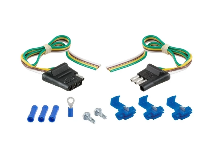 This 4-way flat connector kit is designed to supply power for tail lights, turn signals and brake lights, as well as a ground connection. The connectors feature durable rubber-molded construction and each is made with standard color-coded, bonded wire. This kit includes a vehicle-end socket with 12″ of wire, a trailer-end plug with 12″ of wire, as well as snap locks and other installation hardware to easily splice into your vehicle’s wiring system. This 4-way flat connector is compatible with all 2-wire vehicle systems.