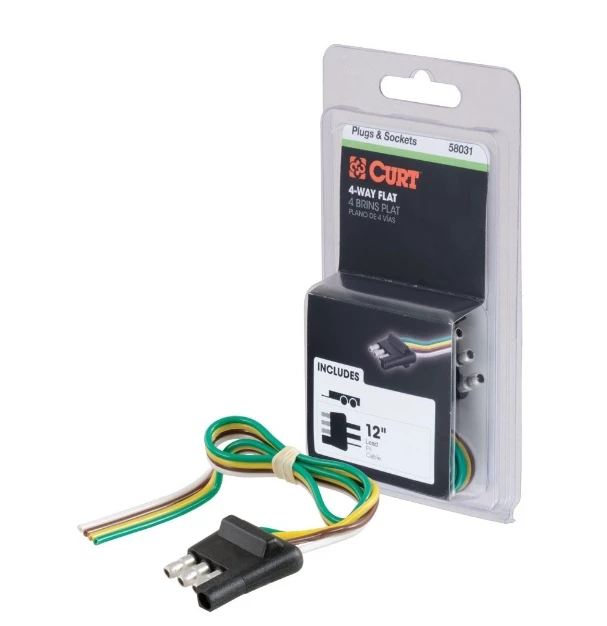 This 4-way flat connector is designed to supply power for tail lights, turn signals and brake lights, as well as a ground connection. It features durable rubber-molded construction and is made with 12″ of standard color-coded, bonded wire to easily splice into your trailer’s wiring system. This 4-way flat connector is a male-end plug, specifically designed for the trailer side of the connection. It is compatible with all 2-wire vehicle systems.