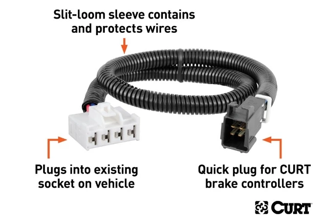 CURT quick plug brake controller harnesses make the installation of your brake controller literally a snap. They are designed to allow your brake controller to plug directly into your vehicle’s power system using an original equipment connector. They are equipped with two plugs — one that snaps into your vehicle’s original equipment socket and the other that connects to a CURT brake controller. CURT quick plug harnesses install with plug-and-play convenience to get you setup and on your way with time to spare. They include two feet of wire and a slit loom sleeve to keep wires well protected and contained.