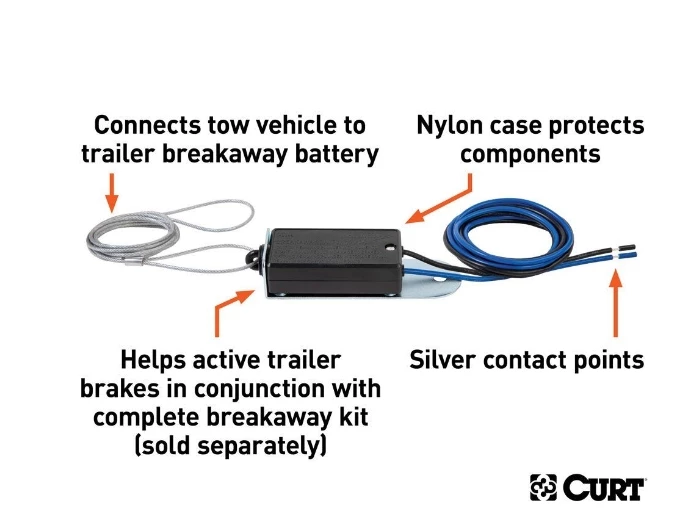 This breakaway switch offers reliable activation of your trailer brakes, featuring silver contact points for a solid connection and a nylon case to protect against the elements. It is designed for use with the CURT Soft-Trac 1 and Soft-Trac 2 breakaway kits and features a high-temp weldable tab for convenient mounting.