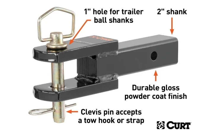 This specialized clevis pin ball mount converts your standard trailer hitch receiver into a multipurpose towing accessory. The thick, removable clevis pin can accept a lunette eye or basic ring and is perfect for a variety of straight towing applications. The CURT clevis pin ball mount offers a gross trailer weight capacity of 6,000 lbs. and a tongue weight capacity of 600 lbs., making it an excellent choice for towing medium to large-size trailers.