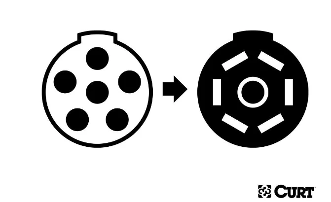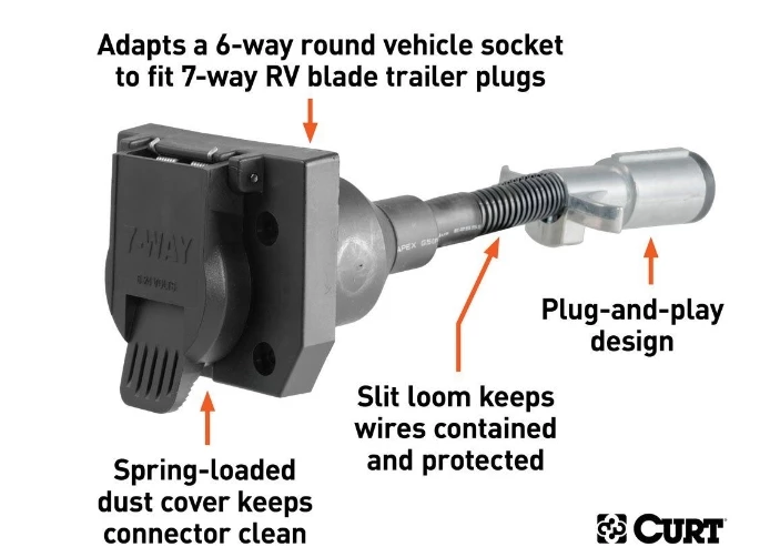 - Adapts 6-way round (center pin taillights) to fit 7-way RV blade trailer plugs