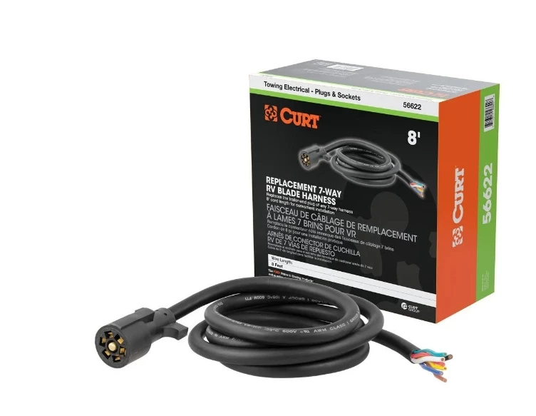This 7-way RV blade replacement harness is designed to replace an existing 7-way plug on your trailer and supply power for tail lights, turn signals, electric trailer brakes, a 12-volt battery, reverse lights and brake lights, as well as a ground connection. It features color-coded wires for easy splicing into your trailer’s wiring system. With an 8′ cable and protective plastic sleeve, this harness is perfect for RV travel trailers, providing more than enough length to accommodate your vehicle-trailer combination and maintaining a solid electrical connection in spite of the elements. This 7-way RV blade connector is a male-end plug, specifically designed for the trailer side of the connection.
