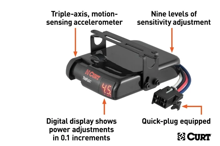 The TriFlexâ„¢ proportion-based brake controller features a compact size, a digital display and the ability to manage up to eight brakes at a time. The feature that sets the TriFlexâ„¢ apart from many others is its triple-axis motion-sensing accelerometer. This integrated circuit component allows the TriFlexâ„¢ to detect every motion of your vehicle and trailer with exact precision and to then apply the perfect amount of braking power for every situation. The TriFlexâ„¢ also automatically adjusts brake output when going up or down a hill and is compatible with anti-lock brakes and cruise control. It comes with a mounting bracket and hardware and can be mounted at various angles on your vehicle’s dash. Best of all, like other CURT brake controls, the TriFlexâ„¢ is protected by a limited lifetime warranty.