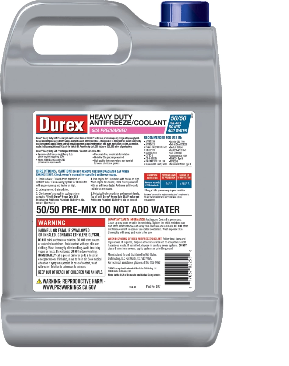 Durex® Heavy Duty SCA Precharged Antifreeze / Coolant Full Strength is a premium quality, virgin ethylene glycol-based coolant prechared with Supplemental Codant Additives (SCAs). This precut is designed for use in heavy duty cooling systems applications and will provide protection against freezing, boil-over, cavitation erosion, corrosion, scale and flaming without SCAs at the initial fill. Provides up to 6,000 hours or 300,000 miles of protection.
