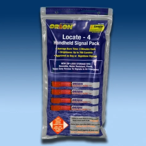 Locator marine signal pack, hand-held red flare signal pack. Our hand-held signals are easy to use, waterproof and safe, with a built in protective handle. They store easily in a re-sealable plastic bag and can be used as replacements in our alert/locate kits. Hand-held red signals burn up to 3 minutes. Brightness up to 700 candela.Â