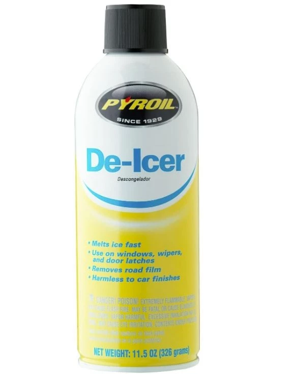 Pyroil Windshield Spray De-icer melts ice on car windows.