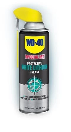 Effective in a temperature range from 0° F to 300° F, WD-40 Specialist White Lithium Grease provides unbeatable protection with long-lasting lubrication on auto hinges, gears, sprockets, outdoor hinges, latches, overhead door tracks, pulleys, cables and guide rails. It’s also excellent for lubricating equipment before placing in storage, and is 50-state VOC compliant.