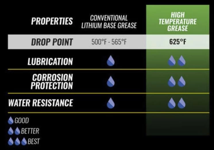 Lithium complex grease. Able to resist melting up to 625 degrees F, it’s also excellent in cold weather