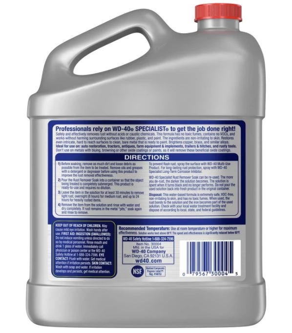 WD-40 Specialist Rust Remover Soak quickly dissolves rust and restores tools, equipment, and surfaces to bare metal without chipping, scraping or scrubbing. Great for removing rust from tools, metal, cast iron, chrome parts, and more without harming paint, gaskets, trim, or other surrounding parts. To remove light rust, leave parts in the solution for 1-3 hours. To remove heavy rust, leave parts in the rust removal solution overnight.